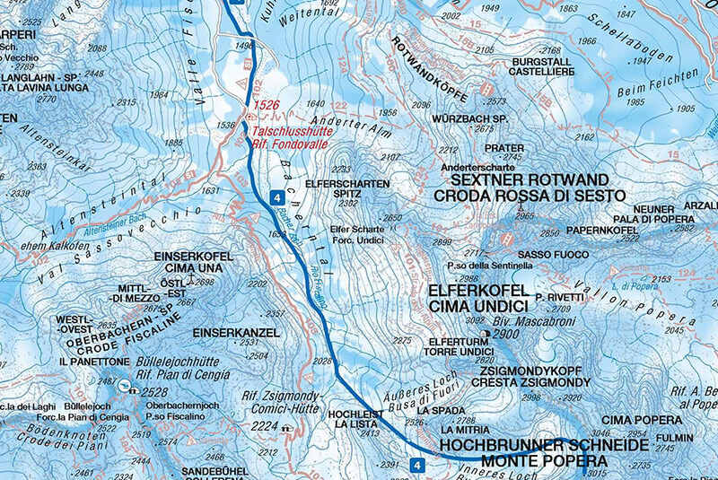 Dal Berghotel in Val Fiscalina e si prosegue fino all’Albergo Dolomitenhof. Grande parcheggio (a pagamento). Iniziamo l’escursione lungo la strada (pista da fondo-fuori dai binari) portandoci quasi in piano al Rifugio Fondovalle, 1562 m; a sinistra dello stesso proseguiamo al centro della valle in direzione sud, entrando nell’incassata Val Fiscalina Alta (attenzione, pericolo di caduta valanghe!). Ai piedi dell’imponente elevazione de La Lista, a ca. 1900 m, seguiamo il ramo della valle a sinistra. Passando per un canale e infine tenendosi a sinistra, raggiungiamo con non poca fatica la “Busa di Dentro”. Da qui pieghiamo verso est e saliamo su terreno in crescente pendenza e sempre più stretto, lungo l’angolo sinistro del catino, alla forcella tra la Cresta Zsigmondy e il Monte Popera. Appena sotto la forcella (a ca. 2800 m) svoltiamo a destra e continuiamo l’ascesa lungo il pendio molto ripido fino a una piccola spalla. Qui solitamente si lasciano gli sci. Con buone condizioni si possono portare anche gli sci in spalla per il breve canalone e si prosegue con gli sci ai piedi gli ultimi 30 min, su terreno in parte roccioso, fino alla vetta. Discesa: per la via di salita.