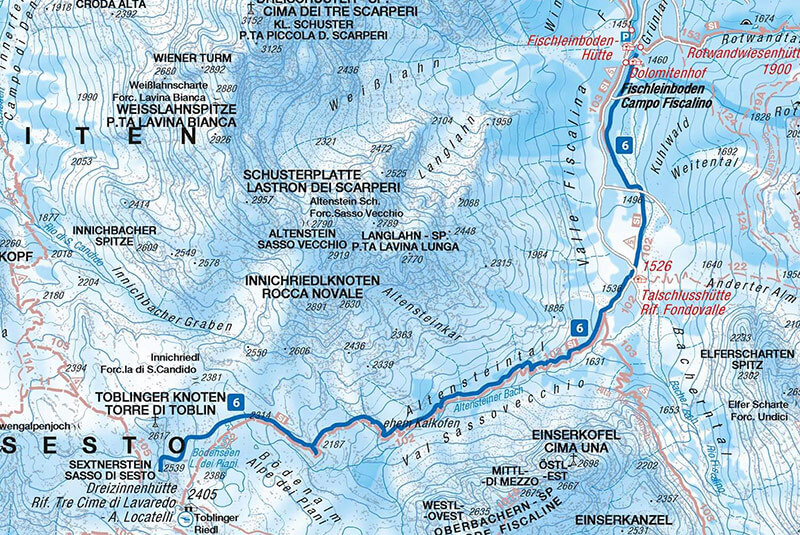 Dal Berghotel in Val Fiscalina e si prosgegue fino all’Albergo Dolomitenhof in auto o pullman. Grande parcheggio (a pagamento). Ascesa: iniziamo l’escursione lungo la strada (pista da fondo-fuori dai bin) portandoci quasi in piano al Rifugio Fondovalle, 1562 m. Qui pieghiamo a destra e saliamo in direzione ovest alle ampie superfici dell’Alpe dei Piani. La Torre di Toblin e il Sasso di Sesto, aspramente contesi durante la Grande Guerra, si ergono diritti davanti a noi. Proseguiamo dapprima in piano e poi lungo pendici mediamente ripide fino all’insellatura tra l’imponente Torre di Toblin e il Sasso di Sesto. Alla fine possiamo avanzare con facilità lungo l’aereo costone nord fino al punto più elevato. La vista sul Monte Paterno e le pareti nord delle Tre Cime di Lavaredo è mozzafiato! Discesa: per la via di salita.